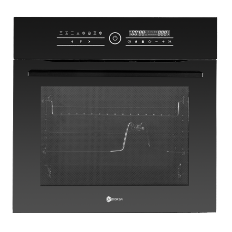 ceramic fiber protected thermal isolation- hot air circulation fan- suitable for making tarts and sweets- full digital touchscreen switch- two baking trays- featuring steak rack- telescopic rail- child safety lock- glazed coating and easy clean up- 8 cooking plans- back sensor- defrost system- wide input range power supply- 3-layer shatterproof door glass- OTG grill with directional grill function- 4 elements- soft closure system- cooling fan- glass design- glass over steel design- 65 liter capacity- oven mitt and apron