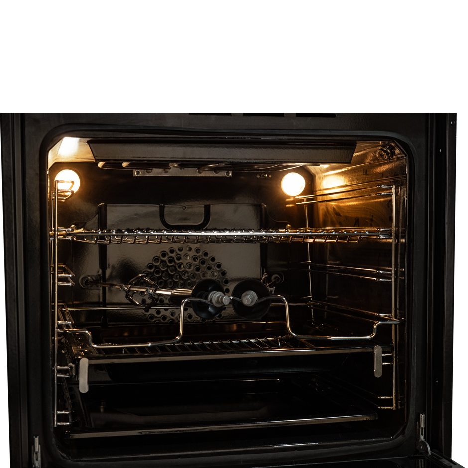 This electric oven, with an 82-liter capacity, provides enough space for simultaneously cooking multiple dishes, pastries, or even two whole chickens on the rotisserie. The 6-level rack system also allows for maximum use of the cabinet space.