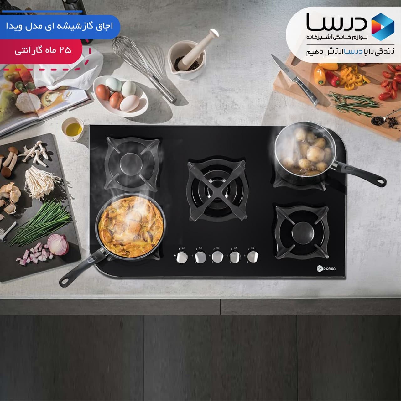 همه ما می دانیم که انتخاب درست لوازم آشپزخانه در کیفیت آشپزی نقش زیادی دارد و یکی از مهم ترین و پرکاربردترین لوازم آشپزخانه اجاق گاز است.اجاق گازهای درسا که به صورت توکار تولید می شوند فضای زیادی در آشپزخانه اشغال نمی کنند و طراحی آشپزخانه شما را زیباتر می کنند.اجاق گاز بینا یکی از اجاق گازهای استیل شیشه شرکت درسا است .جهت نصب اجاق گاز ویدا باید برشی با ابعاد 45*81 سانتی متر روی کابینت ایجاد شود. این اجاق گاز دارای 5 شعله در اندازه های پلوپز ، بزرگ ، متوسط و کوچک است که هرکدام توان حرارتی متفاوتی دارند.
